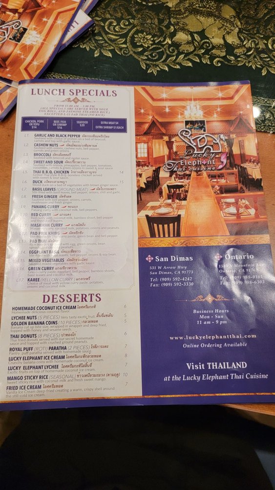 Located in San Dimas, CA, Lucky Elephant Thai Cuisine offers an inviting exploration of authentic Thai flavors. The menu features an array of choices catering to every palate, including vegan and vegetarian options. Notable highlights include the irresistibly creamy masaman curry, flavorful Pad See Ew, and the adored crab rangoons, making each visit a culinary adventure.